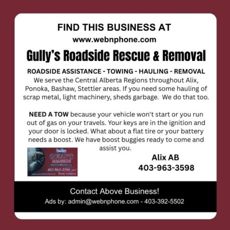 ROADSIDE ASSISTANCE - TOWING - HAULING - REMOVAL SERVICES. We serve the Central Alberta Regions throughout Alex, Ponoka, Bashaw, Stettler areas. If you need some hauling of scrap metal, light machinery, sheds or garbage, we do that to.